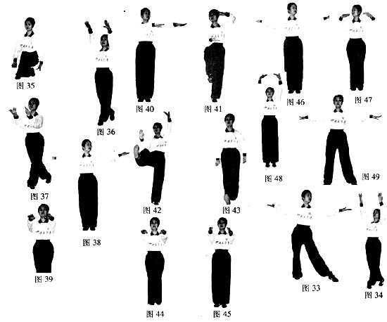 动作:1、双手从体两侧穿手至肩高(掌朝上),横左步(图33);