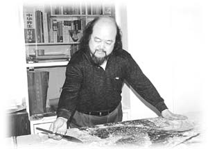 4号(金)狼毫笔:笔顶端为半月铲形刮板,套入笔杆,用以刮、皱等手法。